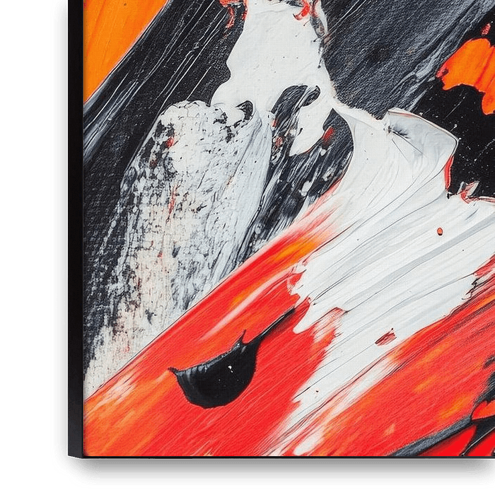 Een vurig samenspel van felrood, gedurfd oranje en diepzwart ontvouwt zich hier in dynamische penseelstreken. Deze expressieve compositie roept energie en passie op, ideaal voor een moderne woonkamer die uitnodigt om te blijven hangen en te discussiëren. Een blikvanger die gesprekken stimuleert en creatieve inspiratie opwekt.