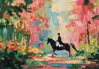 Dit levendige, impressionistische schilderij toont een man die een zwart paard berijdt langs een kleurrijk pad. Het paard rijdt in volle galop naar links, de benen gestrekt, terwijl de ruiter in een donker pak en hoed de teugels vasthoudt. De achtergrond is gevuld met energieke penseelstreken in roze, oranje, geel en groen, die bomen en…