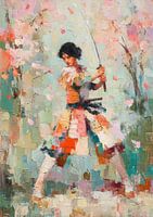 Een levendig schilderij van een vrouwelijke samoerai in een dynamische pose. Ze houdt een zwaard diagonaal voor zich en draagt een kleurrijke kimono in oranje, rood, blauw en wit, met zichtbare plooien en textuur. Haar donker gekrulde haar omlijst haar gefocuste gezicht, haar linkerhand houdt het zwaard vast, haar rechter achter haar hoofd. De achtergrond is impressionistisch met zachte, vloeiende penseelstreken in roze, blauw, groen en bruin, doorspekt met vallende roze bloemblaadjes die beweging suggereren. De expressieve schilderstijl benadrukt kleur, vorm en energie en plaatst de samuraifiguur in het centrum van de compositie.