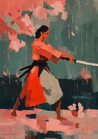 Een expressief schilderij van een vrouwelijke samoerai in een dynamische pose. Ze draagt een rode kimono met zwarte accenten en een wit onderkleed, de zwarte riem houdt de kimono om haar middel. Ze houdt het zwaard horizontaal voor haar lichaam, de punt van haar linkervoet naar voren gestrekt, haar rechtervoet ondersteunt haar gewicht. De achtergrond bestaat uit abstracte penseelstreken in roze en oranje, die doen denken aan kersenbloesems, met donkergroene contrasten. Het horizontale grondvlak weerspiegelt licht en beweging. De gestuele schilderstijl benadrukt actie, stroming en energie, terwijl kleur en vorm de figuur en zijn zwaard als middelpunt benadrukken.