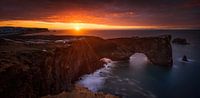 Panorama of beautiful sunrise over Dyrholaey cliffs and rocky arch, Iceland