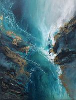 Dompel jezelf onder in de betoverende diepten van dit originele abstracte kunstwerk, waar de vloeiende oceanische blauwtinten samenkomen met het opvallende contrast van metallic goud en aardse ondertonen. Dit werk combineert meesterlijk rijk turquoise, diep marineblauw en glinsterende gouden accenten, wat de betoverende beweging van water en de tijdloze schoonheid van natuurlijke landschappen oproept.