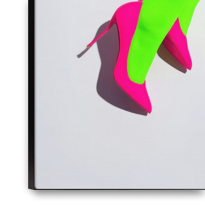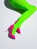 Een beeld waarin balans en spanning samenkomen. De felgroene benen en roze hakken creëren een energieke combinatie die direct opvalt. De houding is gekruist en elegant, waardoor het lichaam een vloeiende lijn vormt die door het beeld loopt.