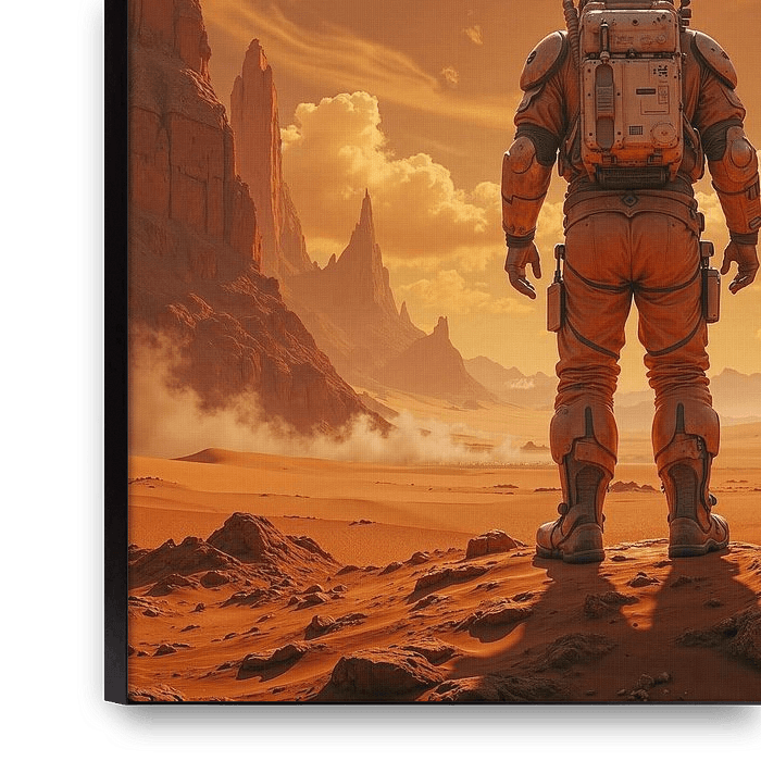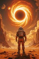 In een buitenaards, rotsachtig woestijnlandschap staat een eenzame astronaut en kijkt omhoog naar de hemel. Voor hem opent zich een enorm zwart gat, omringd door een brandende ring van licht en energie. De lucht is gevuld met warme oranje- en goudtinten, terwijl verre hemellichamen stil op de achtergrond zweven.