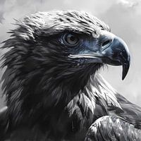 Deze afbeelding is een opvallend monochromatisch portret van een adelaar, waarin de koninklijke houding en doordringende blik van deze majestueuze roofvogel wordt vastgelegd. De veren van de adelaar zijn tot in de kleinste details weergegeven, waardoor de kijker de textuur virtueel kan voelen. Zijn scherpe, gebogen snavel en scherpe ogen worden benadrukt, wat de roofzuchtige aard en het scherpe zicht van de adelaar benadrukt. De grijstinten die in de afbeelding worden gebruikt, geven het een tijdloze kwaliteit, waarbij het samenspel van licht en schaduw de diepte en contouren van de gelaatstrekken van de adelaar naar voren brengt. De achtergrond is vakkundig vervaagd, waardoor de adelaar het middelpunt blijft, wat symbool staat voor focus en kracht. Dit portret, met zijn levensechte nauwkeurigheid en artistieke schakeringen, communiceert de essentie van de geest van de adelaar en de vrijheid die hij belichaamt. Het is een eerbetoon aan de wildheid en schoonheid van de natuur, ideaal voor degenen die de pracht van vogels en de symbolische kracht bewonderen die adelaars in veel culturen vertegenwoordigen.