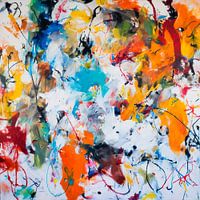 Een abstract schilderij vol levendige kleuren, dunne, zwarte lijnen en krabbels kronkelen door de compositie en geven het geheel een dynamische en energieke uitstraling. De penseelstreken zijn zichtbaar, wat een gevoel van beweging en spontaniteit suggereert. De achtergrond is een gestructureerde witte ondergrond waardoor de kleuren er…