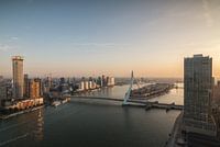 Zonsopkomst in Rotterdam vanaf de kop van Zuid met de Erasmusbrug en de Zalmhaventoren op de achtergrond.