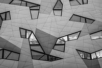 Zwart-wit foto van de markante vormen en ramen van het ROC gebouw in Nijmegen. 's Ochtends vroeg branden de lampen ven zijn de eerste medewerkers al aan het werk.