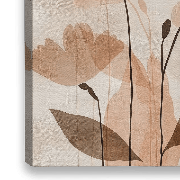 Earth Toned Whispers - Dit bloemen schilderij kenmerkt zich door een subtiele en rustgevende uitstraling, waarin verschillende tinten bruin en beige de overhand hebben. De bloemen zijn semi-abstract afgebeeld met een zekere mate van stilistische vervorming, wat een moderne twist geeft aan wat in essentie een zeer traditioneel onderwerp…