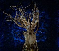 Tijdens mijn hardlooprondje vond ik een wortel van een maisplant. Eenmaal thuis heb ik deze in een oude krant gevouwen, buiten op een droge plek gelegd en er een paar flinke stenen op gelegd. Na een paar weken had ik het gewenste, redelijk platte, resultaat. De achtergrond is een eigen kleurmengsel acrylverf. Verder heeft deze niets…