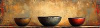 Details: stilleven, schalen, aardetinten, oranje, rood, zwart, bruin, goud, abstract, modern