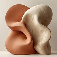 Twee organische vormen leunen tegen elkaar aan en vormen samen een krachtig geheel. De combinatie van warme terracotta en zachte, lichte tinten geeft het werk een aardse en natuurlijke uitstraling. De vloeiende lijnen zorgen voor beweging, terwijl het geheel rustig blijft.