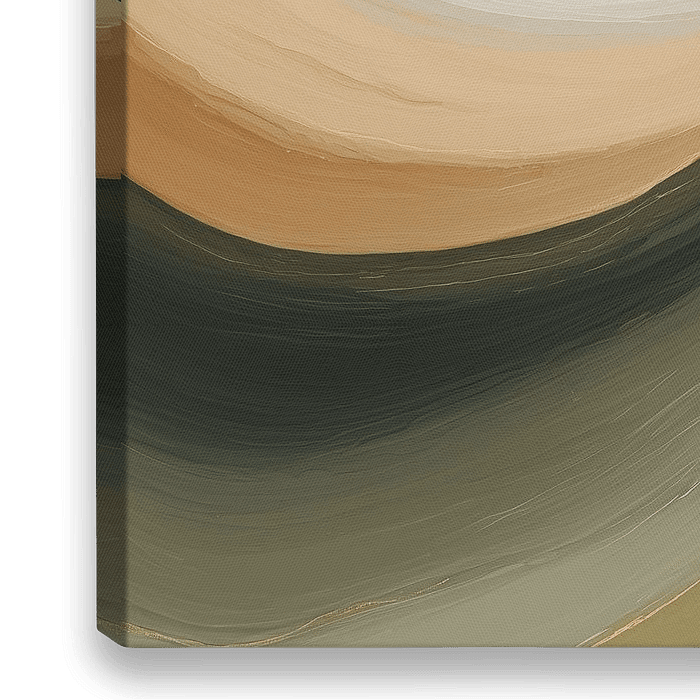 Een organisch gelaagd landschap in warme aardetinten. De vloeiende vormen doen denken aan geologische structuren en natuurlijke stromingen. De kleuren — beige, groen en goud — zorgen voor een harmonieuze uitstraling die rust brengt in elke ruimte.
