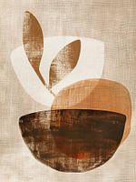 Earthy Echoes - Dit abstracte schilderij bestaat uit gelaagde organische vormen die elkaar overlappen en vormen een minimalistische compositie op een getextureerde achtgrond die lijkt op grof linnen of jute. Drie hoofdelementen trekken de aandacht: de onderste vorm is een groot, donkerbruin, schijnbaar solide object dat de basis vormt. Daarboven liggen twee abstracte organische vormen met een tweekleurige vervaging, waarvan de bovenste in tinten van bruin varieert en de grootste wit is met een fijne textuur die de vorm van een blad suggereert. De kleuren creëren een warm, uitnodigend palet, en de vormen geven een gevoel van rust en eenvoud.