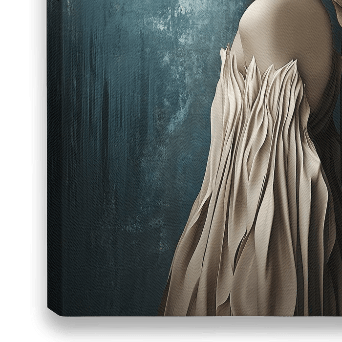Profiel portret van een vrouw met een elegante en etherische uitstraling, ze draagt een surrealistische hoed gemaakt van boomschors met grote, vloeiende bloemblaadjes en een delicate, geplooide jurk. De achtergrond heeft een ruwe grunge textuur in een donkere blauwgroene kleur die contrasteert met de zachte naturel tinten van haar…