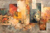 Een abstract schilderij met een dynamische compositie van rechthoekige vormen en blokken die overlappen en een kleurenpalet dat gedomineerd wordt door warme en aardse tinten. De textuur is rijk en gelaagd met zichtbare penseelstreken en een mix van gladde en ruwe oppervlakken, wat diepte creëert. De achtergrond heeft een mix van zachte…
