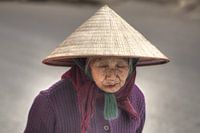 Een oude dame wandelt op haar gemakje door de straten van Hoi An.
