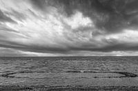 De waddenzee bij laag water met een imposante wolkenlucht in zwart-wit. De foto is gemaakt op de Waddendijk op Oost-Vlieland