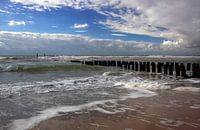 Mooie blauwe lucht,witte stapel wolken en golfbreker bij vloed op het strand van Zoutelande,Zeeland (NL).De zee was tamelijk onrustig en er stonden mooie schuimkoppen op,de zon scheen,prachtige herfstdag aan de Zeeuwse kust.