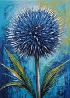 Afgebeeld in acryl neemt de echinops bloem een gedurfde, sculpturale vorm aan met haar stekelige, bolvormige hoofd weergegeven in koele blauwe tinten. Het canvasoppervlak voegt diepte en tactiele kwaliteit toe en versterkt de moderne, getextureerde look van de bloem.