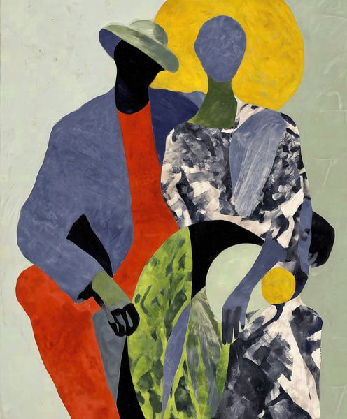 Een hedendaags abstract schilderij waarop twee gestileerde menselijke figuren zijn afgebeeld met gezichtsloze vormen, gedurfde kleurvlakken en gelaagde texturen, dat een gevoel van intimiteit, identiteit en stille verbondenheid oproept