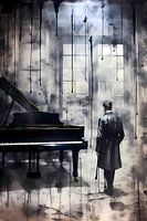 Ontdek de Echo van Stilte, een meeslepend modern kunstwerk dat de essentie van reflectie en diepgang in monochrome tinten vangt. De subtiele interplay van licht en schaduw speelt op de delicate contouren van een piano en een contemplatieve man, waarbij elke lijn en elke vorm verhalen vertelt van onuitgesproken gedachten en verstilde…