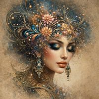 De afbeelding toont een portret van een vrouw in een weelderige, fantasierijke stijl. De vrouw draagt een uitgebreide, koninklijke of sprookjesachtige hoofdtooi versierd met gouden bloemen, parels en schitterende juwelen. Haar haar is gestileerd in sierlijke, vloeiende krullen die opgaan in de achtergrond. Ze heeft opvallende oogmake-up…