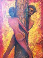 Echo of the Unseen toont twee menselijke figuren, naakt als de natuur zelf, ingebed in de stille aanwezigheid van een boomstam. De vrouw leunt naar links en kijkt achterom, de man staat achter de boomstam en kijkt er ook omheen - beiden in dezelfde richting, maar zonder elkaar te zien. Nabijheid en afstand bestaan…