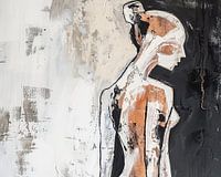 Echoed Silhouette - Dit abstracte schilderij toont een gestileerde menselijke figuur, opgebouwd uit brede, ruwe penseelstreken in zwart, wit en aardetinten.
