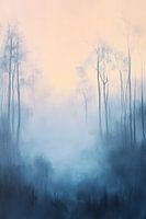 De afbeelding roept een gevoel van stilte en mysterie op, waarin de natuur zich in een bijna ongrijpbare, dromerige staat bevindt. Het landschap is bedekt met een zachte, dichte mist die als een sluier over het bos hangt, waardoor de bomen lijken te verdwijnen in de horizon. De ranke, hoge stammen strekken zich uit naar de hemel, hun dunne takken aan de bovenkant lijken te fluisteren in de nevel die hen omhult. De nevel fungeert als een soort grens tussen het bekende en het onbekende, tussen zichtbaarheid en het onzichtbare, waarbij alles in een vreemde, betoverende stilte verkeert.