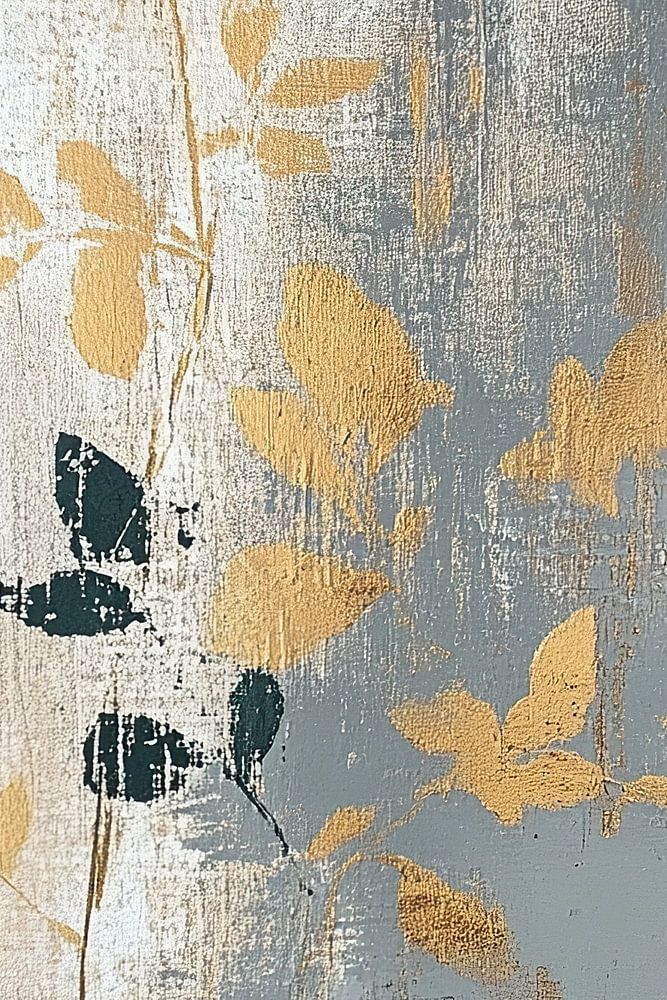 Echoes of Autumn Elegance - Dit abstracte schilderij toont elegante bladermotieven in gouden en donkergroene kleuren op een getextureerde achtergrond die wisselt tussen lichte en donkere grijstinten.