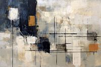 Echoes of Civilization's Edge - Dit abstracte schilderij toont een complexe compositie van overlappende rechthoeken en grillige lijnen in een suggestie van zowel constructie als verval, met dominantie van blauw- en aardetinten en accenten van oranje en zwart.