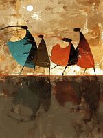 Echoes of Color - Dit abstracte schilderij toont drie gestileerde vogelachtige figuren in levendige tinten blauw, oranje en rood met een subtiel weerspiegeld beeld tegen een achtergrond met aardetinten en een centrale witte zon.