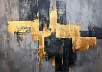 Echoes of Forgotten Gold - Dit abstracte schilderij kenmerkt zich door een dynamisch contrast van gouden verfvlakken tegen een sober grijs en zwart achtergrond, waarin rechthoekige en onregelmatige vormen samenvloeien tot een visueel boeiend geheel.