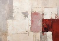 Echoes of Minimalism - Dit abstracte schilderij kenmerkt zich door een compositie van overlappende blokken en rechthoeken in een pallet van beige, wit en rode accenten die contrasteren tegen een textuurrijke achtergrond.