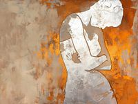 Echoes of Tangerine - Dit abstracte vrouwen schilderij toont een gestileerde vrouwelijke figuur in witte en zilveren tinten tegen een levendige oranje achtergrond met een verweerd effect.