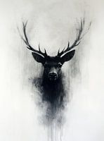 Echoes of the Forest King - Dit dieren schilderij toont een krachtige hertenkop met imposante geweien die opgaan in krachtige, neerwaartse, zwarte en witte penseelstreken.