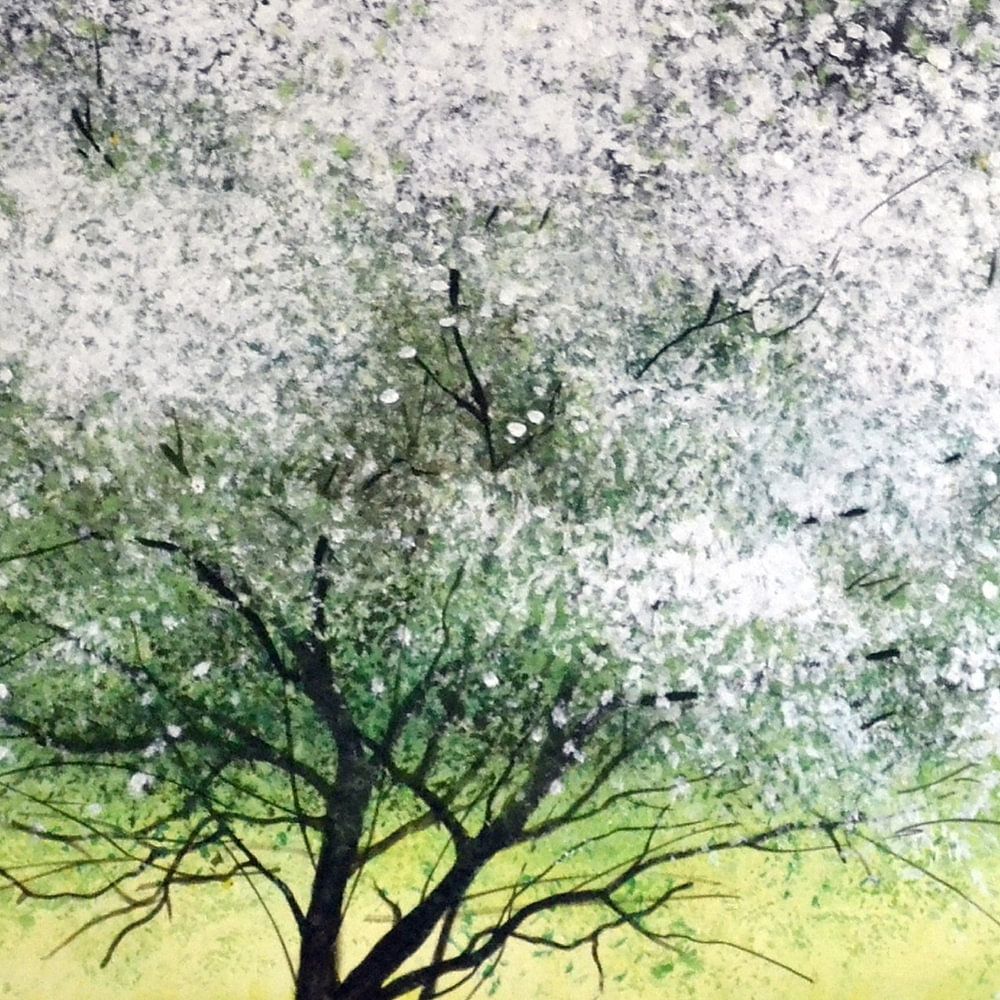 Een portret van een boom in bloei, in zijn natuurlijke omgeving. Het is een bloeiende amandelboom, realistisch geschilderd.