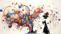 Het lijkt te spruiten uit een zwart-witte basis, wat wellicht duidt op de eenvoud en de chaos waaruit creativiteit kan ontspringen. De boom is versierd met allerlei kleurrijke objecten die lijken te zweven en te dansen rond zijn takken, zoals ballen, bloemen, en vlinders, wat een gevoel van lichtheid en beweging geeft. De achtergrond blijft neutraal, waardoor de aandacht volledig uitgaat naar de boom en zijn kleurrijke ornamenten. Aan de rechterzijde staat een elegant geklede vrouw, die met een penseel en een palet in de hand, de wereld om haar heen tot leven lijkt te brengen. Haar houding is ontspannen en geconcentreerd tegelijk, wat een gevoel van vrede en tevredenheid oproept.