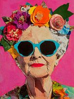 Een moderne abstracte collage toont een oudere vrouw met een opvallende zonnebril die zelfvertrouwen en stijl uitstraalt. De compositie is levendig, met uitgesneden bloemen in felle, speelse kleuren zoals oranje, geel en paars verspreid om haar heen. Haar gezicht is vereenvoudigd, met de nadruk op expressie in plaats van details. De roze achtergrond creëert een dynamisch contrast dat bijdraagt aan de levendige energie van het beeld. De abstracte, gelaagde elementen geven een gevoel van beweging en plezier en combineren moderne kunst met een gevoel van tijdloosheid en individualiteit.