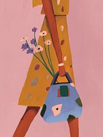 Een speels en eigentijds kunstwerk dat alledaagse schoonheid viert. Het fragment van een vrouw in een mosterdgele jurk met een tas vol bloemen straalt lichtheid en vrolijkheid uit. De contrasterende kleuren – zachtroze achtergrond, levendig geel en frisse blauwtinten – geven het werk een moderne en optimistische uitstraling. Perfect als vrolijke blikvanger in elk interieur.