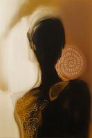 De figuur lijkt op het punt te staan te verdwijnen in zijn eigen schaduw; de grens tussen lichaam en achtergrond vervaagt, alsof het bestaan zelf oplost in het licht dat het probeert te begrijpen. De eclips symboliseert hier niet enkel verlies, maar ook transformatie — een tijdelijk samenvallen van zichtbaarheid en vergetelheid.