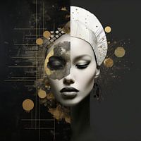 Dit kunstwerk nodigt de kijker uit om de subtiele nuances van schoonheid en cultuur te verkennen en te waarderen, en om te genieten van de complexe samensmelting van stijlen en elementen die de kunstenaar heeft gecreëerd.