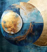 Abstract schilderij met ronde vormen en een grove metaal structuur in voornamelijk blauw en goud tinten.