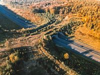 Ecoduct, ecopassage, natuurbrug of wildwissel over een snelweg door het bos. De wildbrug verbindt twee natuurgebieden op de Veluwe, Gelderland, aan weerszijden van de weg. Het verkeer rijdt via een tunnel onder het ecoduct door.