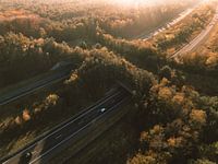 Ecoduct, ecopassage, natuurbrug of wildwissel over een snelweg door het bos. De wildbrug verbindt twee natuurgebieden op de Veluwe, Gelderland, aan weerszijden van de weg. Het verkeer rijdt via een tunnel onder het ecoduct door.