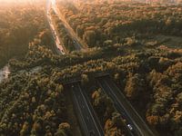 Ecoduct, ecopassage, natuurbrug of wildwissel over een snelweg door het bos. De wildbrug verbindt twee natuurgebieden op de Veluwe, Gelderland, aan weerszijden van de weg. Het verkeer rijdt via een tunnel onder het ecoduct door.