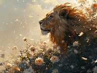 Deze prachtige afbeelding vangt de essentie van een leeuw in een veld vol bloemen, zijn blik peinzend en ver. De achtergrond is een delicate mengeling van crème en goudgeel, wat het tafereel een zachte gloed geeft. Dit wordt gecomplementeerd door de witte en roze bloemen, met accenten van donkerblauw en groen in de schaduwpartijen. De fijne details in de textuur van de manen en de bloemen creëren een dynamische maar toch vredige compositie. Dit kunstwerk zou ideaal zijn voor een interieur dat natuurlijke elementen en neutrale kleuren waardeert, zoals een Scandinavische stijl, of een klassieke inrichting die een vleugje natuurlijke schoonheid en sereniteit zoekt.