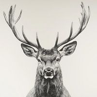 Deze indrukwekkende potloodtekening toont een majestueus edelhert in een klassieke portrettekening die wordt gekenmerkt door de buitengewone aandacht voor detail. Het imposante gewei met zijn vele uiteinden domineert de bovenste helft van de afbeelding en geeft het dier een koninklijke uitstraling. Het monochrome kleurenschema in verschillende grijstinten creëert een tijdloze elegantie en richt de aandacht volledig op de meesterlijke lijnen.