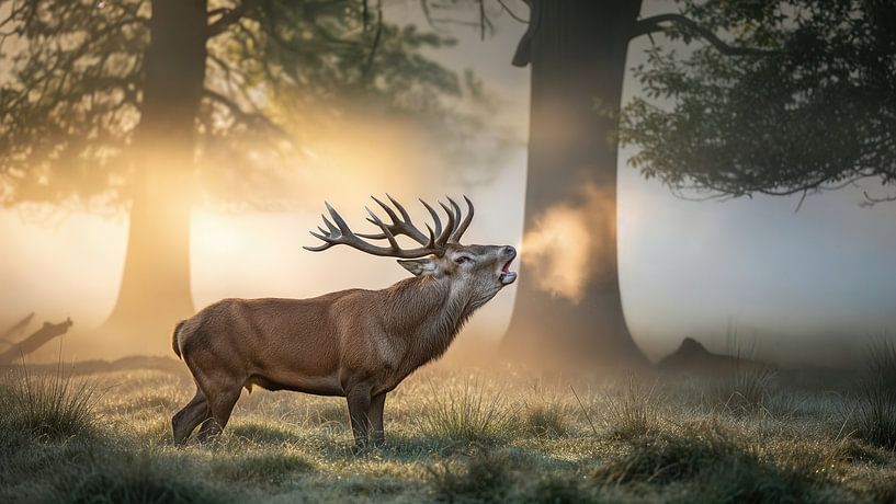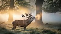 Een edelhert staat te brullen in een mistig bos. Zonlicht filtert door de bomen en creëert een wazig en sfeervol tafereel.